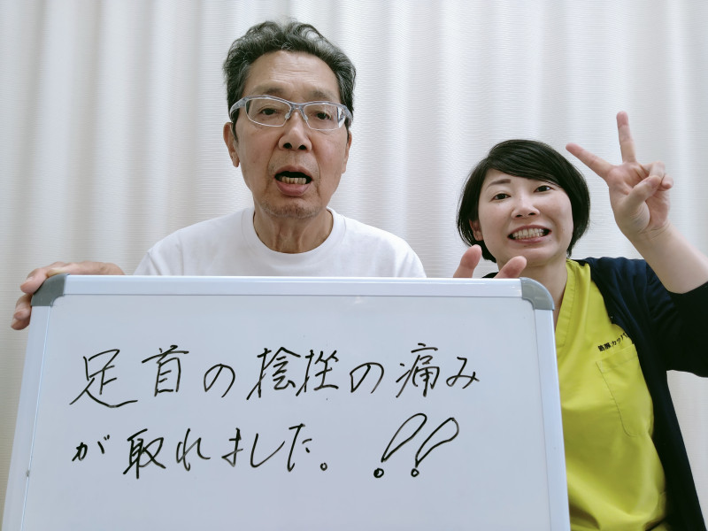 Q、実際に当院に来られて、どのように変わりましたか?(具体的に) A、まだ足首腫れてもいて、歩くのも痛かったが、1回目の施術で腫れが引いて、歩きやすくなった。正直良くなると思っていなかったので、そのまま週1回で通院した。散歩が日課であったが、坂道も階段もなんなく歩けるようになった!